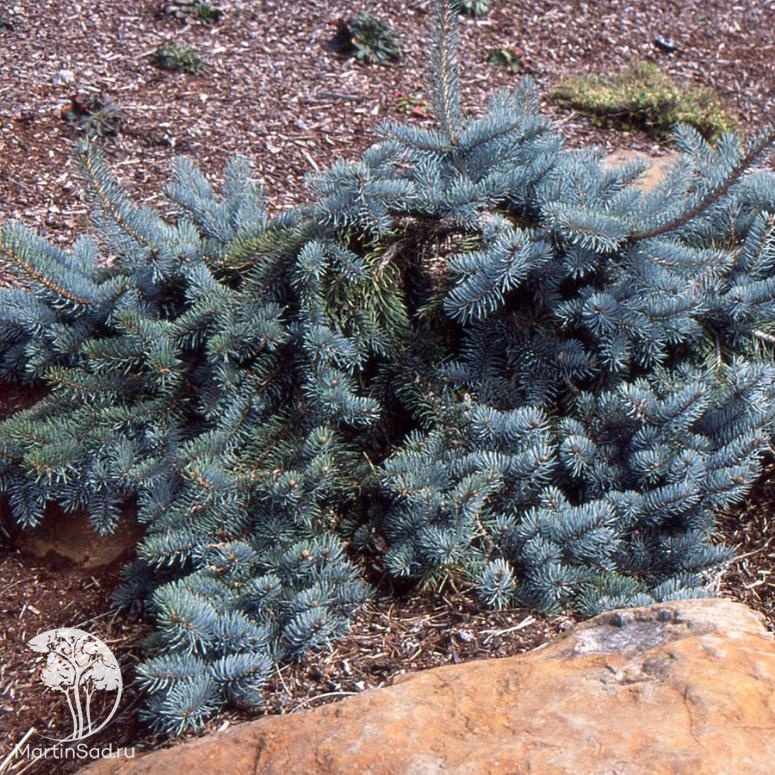 Низкорослая форма с голубой хвоей, стелется и слегка приподнимается — красиво смотрится на склонах и каменистых участках.