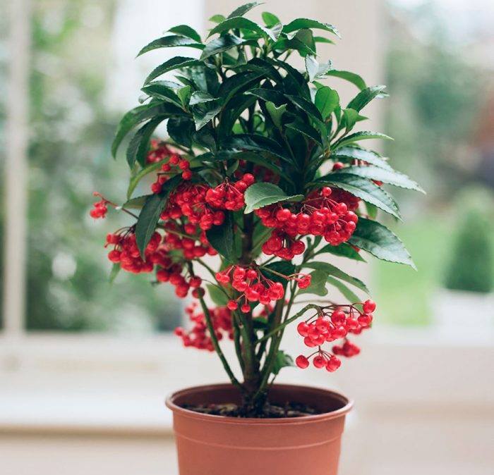 Невысокий кустарник с тёмно-красными ягодами, обладает высокой декоративностью, подходит для выращивания в горшках.