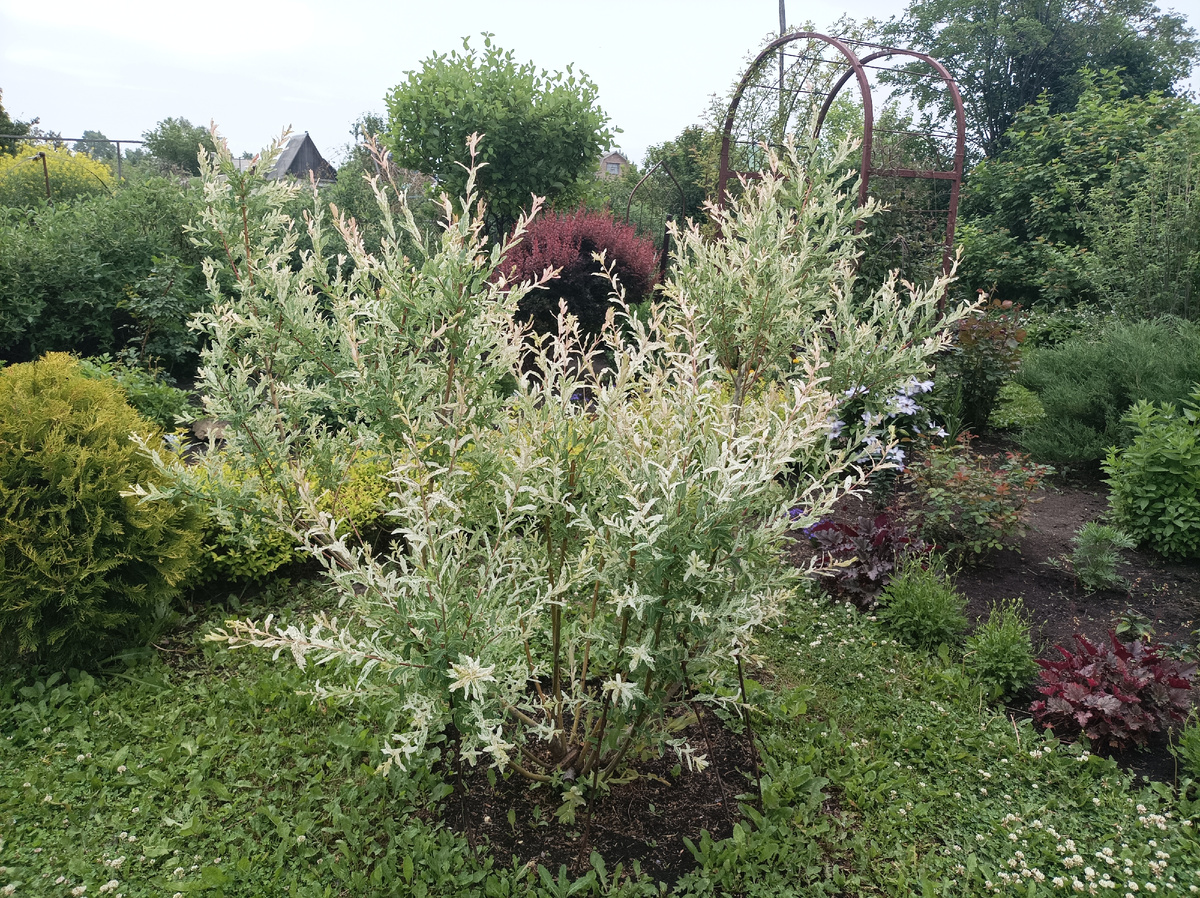 Компактный куст с бело-зеленой листвой и изящными тонкими ветвями.
