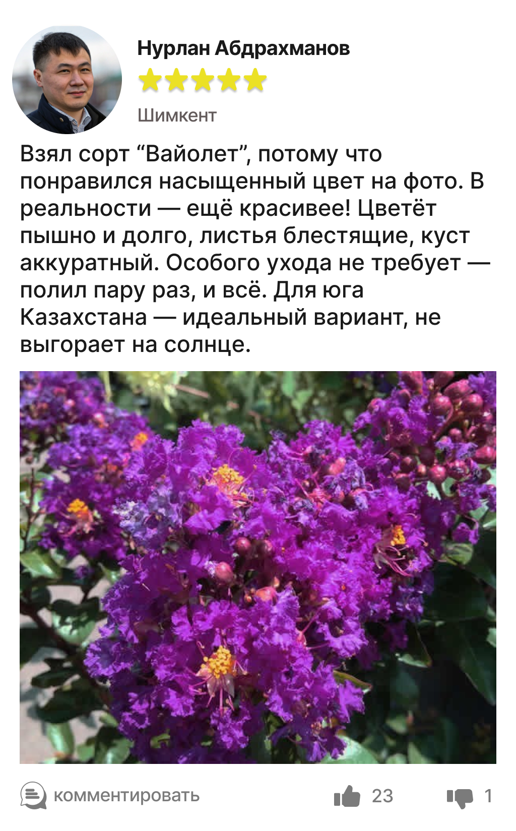 Отборные саженцы индийской сирени, которые легко приживаются в климате Казахстана и радуют пышными гроздьями цветов с раннего лета до поздней осени